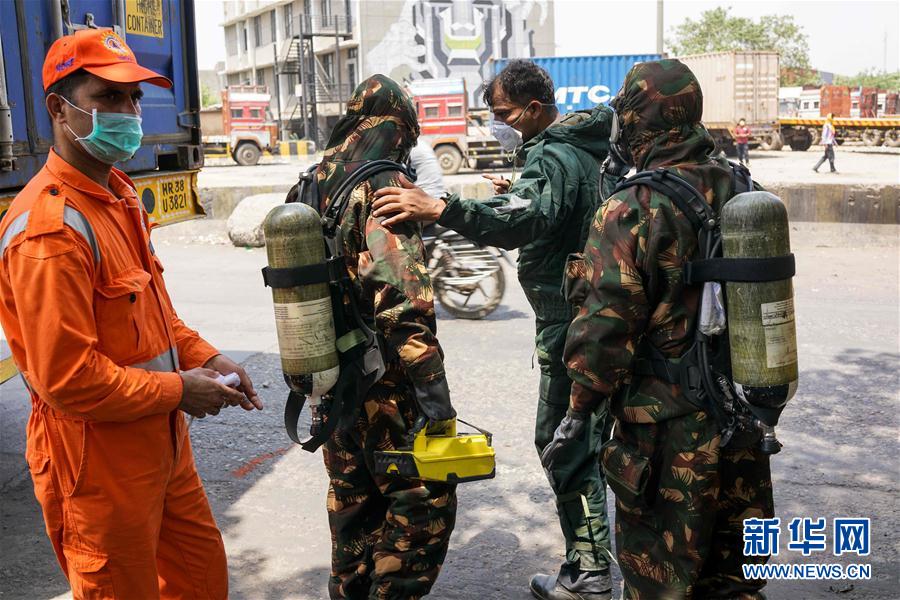 5月6日,在印度新德里,印度全國救災(zāi)應(yīng)急部隊成員準(zhǔn)備進(jìn)入煤氣泄漏事故發(fā)生地。據(jù)警方人員稱,新德里6日發(fā)生煤氣泄漏事故,約有200名學(xué)生出現(xiàn)不同程度的中毒癥狀入院治療。新華社/法新