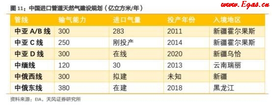 中國的進口管道氣目前主要來自中亞的土庫曼斯斯坦,已經投入使用的中亞ABC線合計輸氣能力達550億立方米/年,在建的中亞D線預計2020年投產,輸氣能力達300億立方米。由于烏克蘭危機造成俄羅斯和歐洲關系緊張,并且主要輸往歐洲的天然氣管網都要進過敵對的烏克蘭,這就造成俄羅斯將其天然氣銷售方向逐步轉為亞洲。并且由于遭受國際制裁和原油價格暴跌導致出口收入大幅下降,俄羅斯也最終放開了遠東地區(qū)的資源開發(fā),長期看這也將大幅增長我國北部能源的潛在供給。