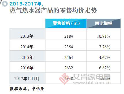 國(guó)內(nèi)外品牌紛紛加碼高端市場(chǎng)的新攻勢(shì),直接帶動(dòng)了燃?xì)鉄崴鳟a(chǎn)品整體均價(jià)的大幅上揚(yáng)。據(jù)中怡康數(shù)據(jù)顯示,2017年1-11月份,燃?xì)鉄崴鞯牧闶劬鶅r(jià)上漲了11.92個(gè)百分點(diǎn)至2938元。盡管考慮到中怡康的監(jiān)測(cè)樣本以連鎖賣(mài)場(chǎng)為主,價(jià)格系數(shù)會(huì)相應(yīng)偏高,但如此大的漲幅印證了燃?xì)鉄崴髡诩铀佼a(chǎn)品結(jié)構(gòu)的調(diào)整和升級(jí)。據(jù)《艾肯家電》統(tǒng)計(jì),2017年,我國(guó)燃?xì)鉄崴鳟a(chǎn)品的整體均價(jià)大致維持在2055元左右,同比漲幅約6.15%。