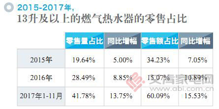 高價(jià)格需要產(chǎn)品技術(shù)上的硬支撐。2017年,無(wú)論線(xiàn)上還是線(xiàn)下,大出水量的燃?xì)鉄崴鳟a(chǎn)品都更加暢銷(xiāo),其中13L以上(含13L)產(chǎn)品的銷(xiāo)量占比均超過(guò)了50%。在燃?xì)鉄崴鞯?ldquo;安全”問(wèn)題得到解決、“恒溫”成為產(chǎn)品標(biāo)配后,“大升數(shù)”已經(jīng)開(kāi)始主導(dǎo)市場(chǎng),體現(xiàn)了用戶(hù)對(duì)洗浴舒適度的更高追求。同時(shí),四季感溫、自動(dòng)變升、斷電記憶、防凍自啟、智控風(fēng)壓、水氣雙閥、語(yǔ)音播報(bào)等更多智能功能的應(yīng)用,也在極大程度上改善了用戶(hù)體驗(yàn)。