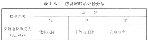 4.3.l管道防腐層缺陷的評(píng)價(jià)可采用交流電位梯度法、直流電位梯度法、交流電流衰減法和密間隔電位法進(jìn)行,防腐層缺陷評(píng)價(jià)分級(jí)應(yīng)符合表4.3.1的規(guī)定。