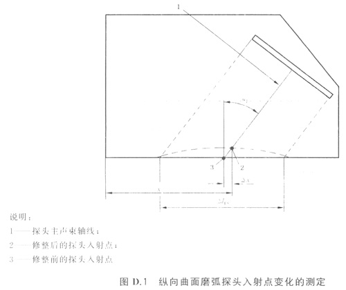 修整后的探頭入射點(diǎn)將會(huì)沿著標(biāo)記線移動(dòng),并且它的新位置可以用手工方法直接在探頭外殼上測(cè)定,如圖D1所示。