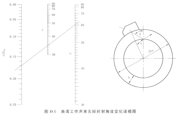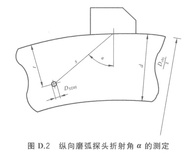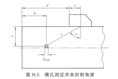 探頭折射角可通過滿足要求的橫孔最大回波來(lái)測(cè)定,也可在工件、參考試塊或者是在比例圖紙上直接測(cè)定,如圖D2所示。
