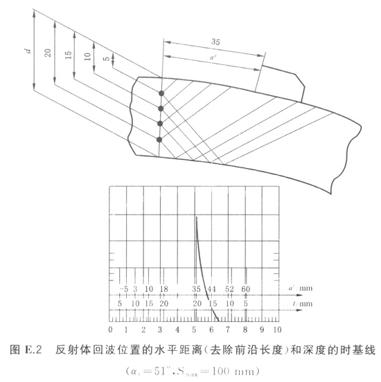 E5.1中闡述的時(shí)基線設(shè)置的原理在這里仍適用,但深度和水平距離不再是線性的。非線性標(biāo)度比例的建立,可在聲程距離比例圖上通過(guò)一系列的位置來(lái)繪出,或由適當(dāng)的公式計(jì)算出,或可從曲面試塊上得到一系列反射體的最高回波來(lái)確定標(biāo)度,中間值可通過(guò)插值法獲得。見(jiàn)圖E.2。