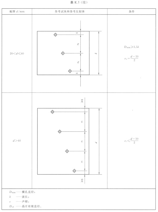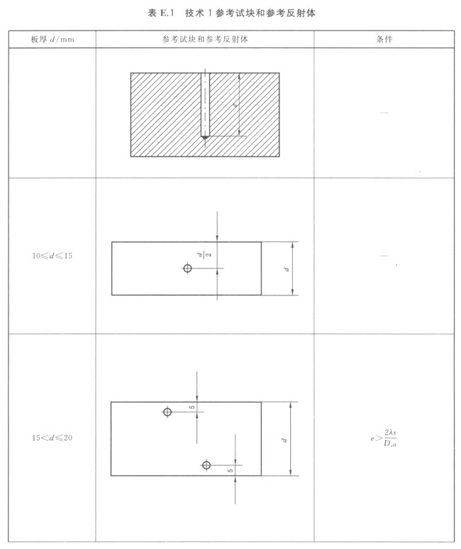 制作DAC曲線所使用的參考試塊,應(yīng)具有一系列不同聲程距離的反射體,且試塊上反射體的深度應(yīng)大于被檢工件的高度。表E.1詳細(xì)給出間距、試塊最小尺寸和反射體的具體要求。