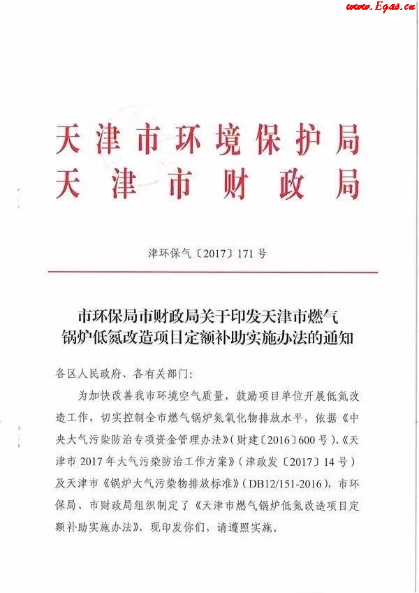 為加快改善我市環(huán)境空氣質(zhì)量,鼓勵項目單位開展低氮改造工作,切實控制全市燃氣鍋爐氮氧化物排放水平,市環(huán)保局、市財政局共同出臺了《天津市燃氣鍋爐低氮改造項目定額補助實施辦法》。自即日起,符合條件的燃氣鍋爐低氮改造項目單位可申請補助資金。