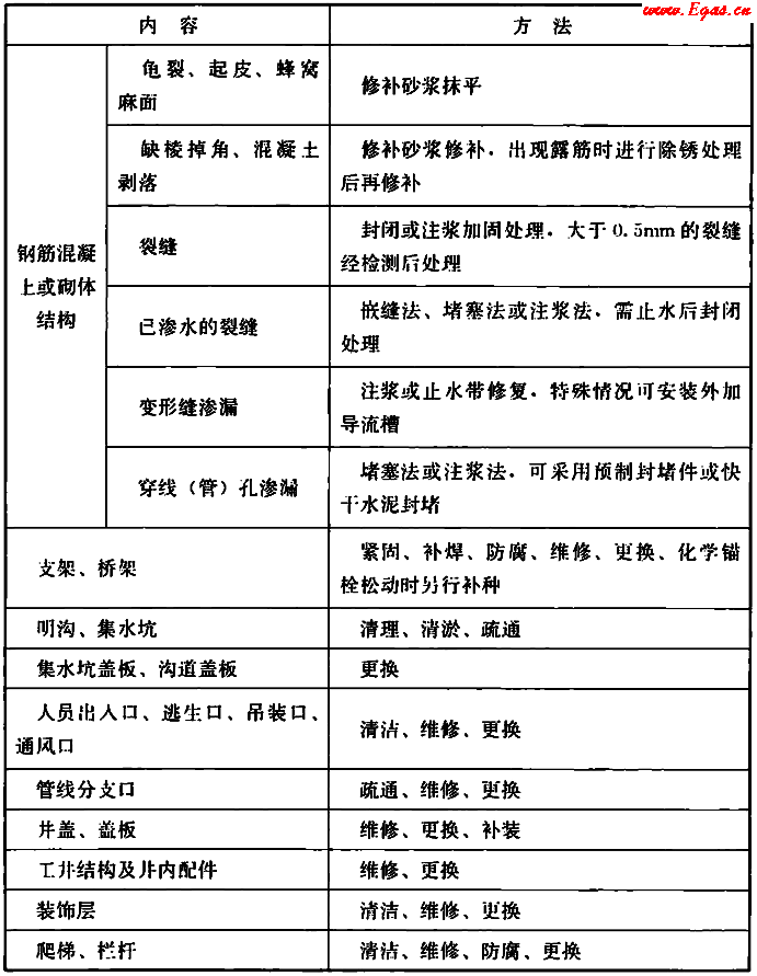 4.5.2 管廊本體維護內(nèi)容與方法應(yīng)符合表4.5.2的規(guī)定。