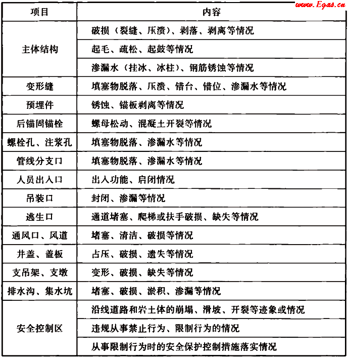 4.3.1 管廊本體巡檢的項目和內(nèi)容應(yīng)符合表4.3.1的規(guī)定。