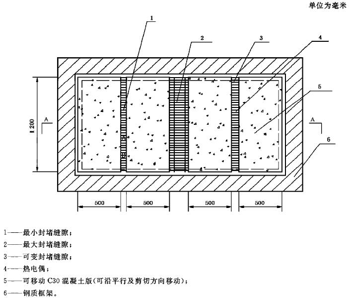 A.7 框架內(nèi)用于支撐縫隙的板材為C30混凝土板(砼板受火面保護(hù)層厚度為10mm)。對于縫隙封堵材料,可根據(jù)委托方的要求,在實施耐火試驗前或試驗過程中采用機(jī)械的方式移動縫隙,移動方式可以是沿被支撐的平面移動縫隙的寬度,也可以是沿剪切方向或其他方向移動,移動的最大距離應(yīng)根據(jù)縫隙封堵材料的性能由委托方確定。