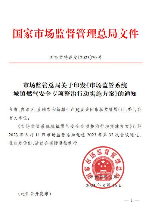 市場(chǎng)監(jiān)管總局關(guān)于印發(fā)《市場(chǎng)監(jiān)管系統(tǒng)城鎮(zhèn)燃?xì)獍踩珜?zhuān)項(xiàng)整治行動(dòng)實(shí)施方案》(國(guó)市監(jiān)特設(shè)發(fā)〔2023〕70號(hào))