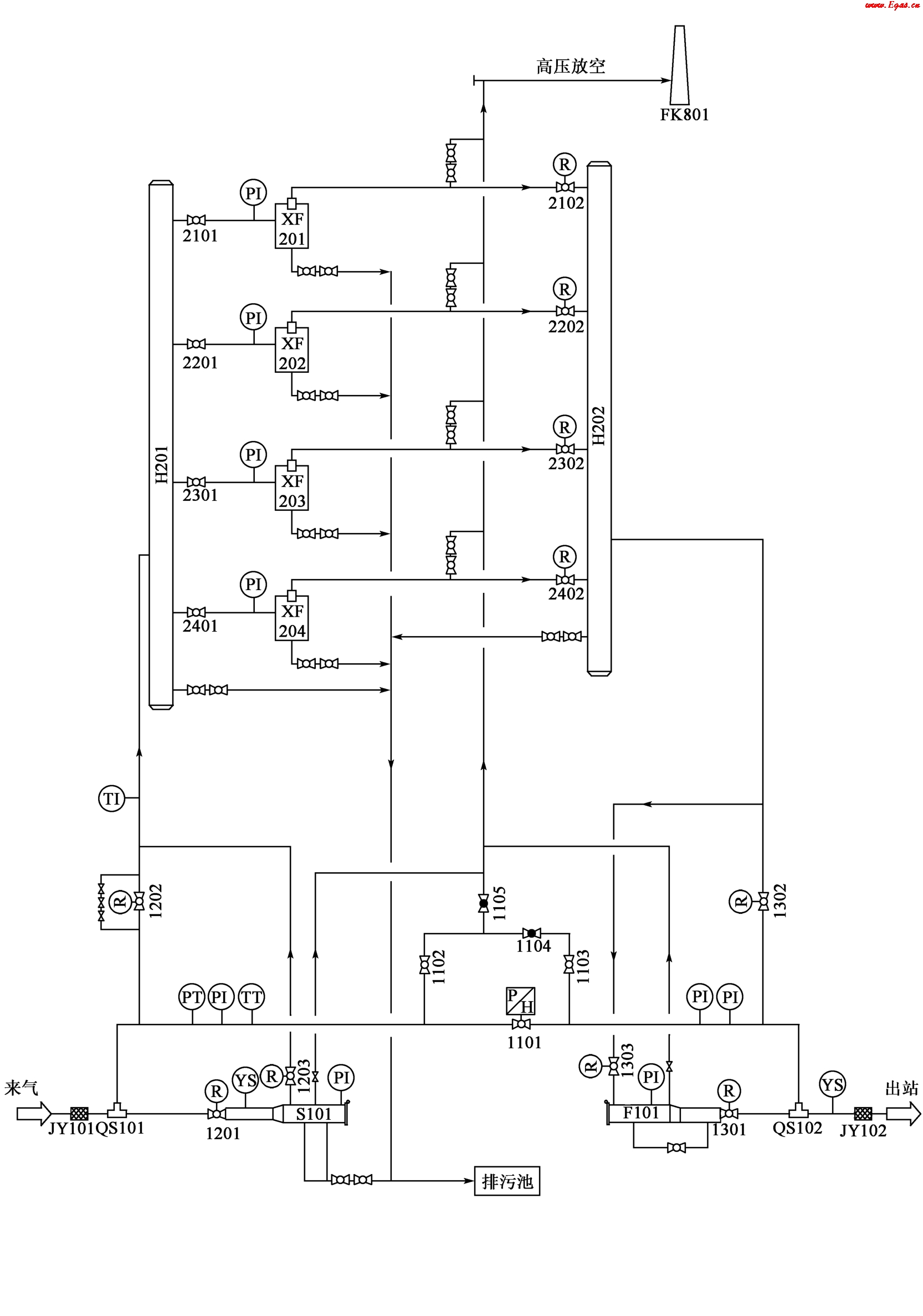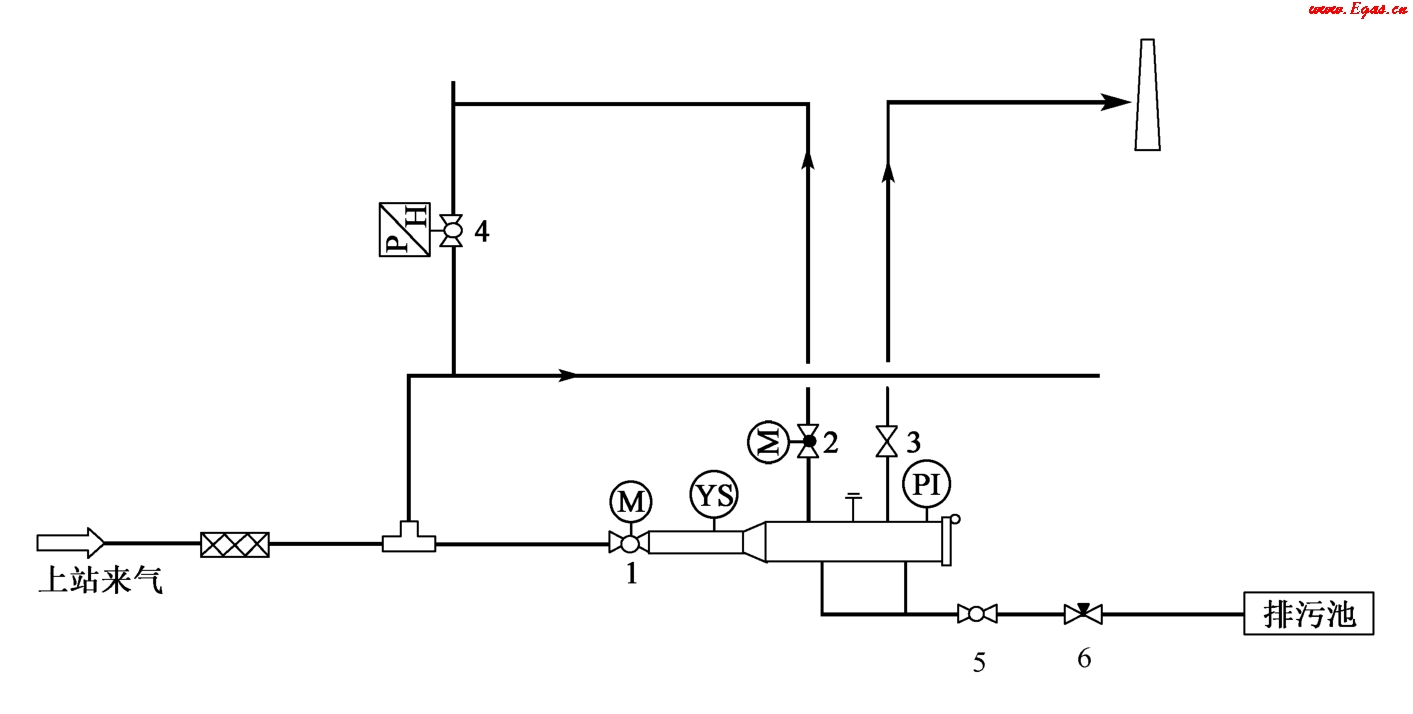 清管站的功能就是收發(fā)清管器。長(zhǎng)輸管道的清管作業(yè)有投產(chǎn)前清管和正常運(yùn)行期間清管。投產(chǎn)前清管的主要目的是清除管道內(nèi)雜質(zhì),主要包括施工期間的泥土、焊渣、水等。正常運(yùn)行期間的清管是指管道運(yùn)行一段時(shí)間后,由于氣體內(nèi)含有一定的雜質(zhì)積存在管線內(nèi),使管輸效率下降,對(duì)管線造成腐蝕等,因此需要對(duì)管線進(jìn)行清管。常見(jiàn)清管站工藝流程圖,如圖3-1所示。