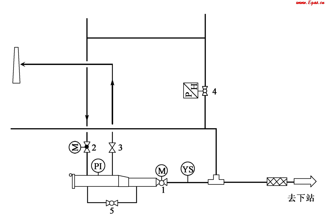 (12)觀察清管器通過(guò)指示器YS,確認(rèn)清管器發(fā)出后,打開(kāi)出站閥4,關(guān)閉閥2、閥1。
