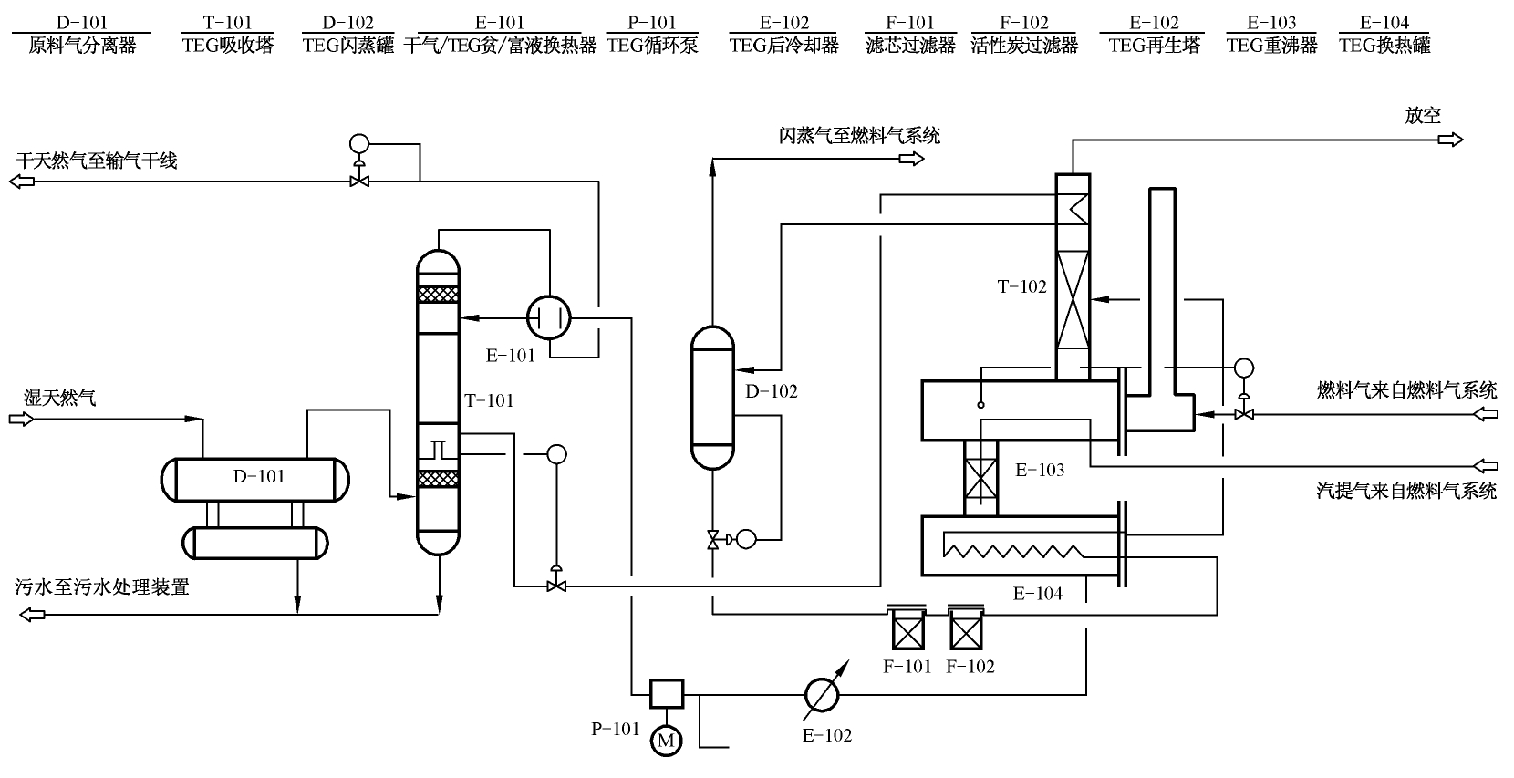 工藝過程的中心設備是吸收塔。用泵將TEG泵到吸收塔的頂部,TEG經(jīng)過吸收塔時與氣流逆流而向下流動,富TEG水溶液從塔底排出,再經(jīng)過冷凝器的盤管升溫并過濾后進入閃蒸罐閃蒸,然后液相流入貧/富甘醇熱交換器,經(jīng)進一步升溫并過濾后進入脫水單元的再生器部分,在再生塔內通過加熱使TEG吸收的水分在常壓下脫除;再生后的TEG經(jīng)貧/富甘醇熱交換器冷卻后,然后泵入吸收塔循環(huán)使用。而濕天然氣由吸收塔底進入經(jīng)入口洗滌器后自下而上與TEG接觸傳質后經(jīng)塔頂分離器后外輸。