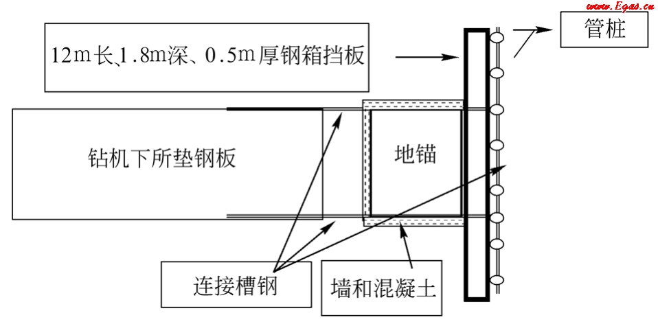 (4)鉆機(jī)的錨固對(duì)于定向鉆來(lái)說(shuō)非常重要。鉆機(jī)在安置期間發(fā)生事故的情況經(jīng)常發(fā)生,甚至和鉆進(jìn)期間發(fā)生事故的概率相當(dāng),尤其是對(duì)地下管線的損壞。在鉆機(jī)錨固時(shí),要防止將錨桿打在地下管線上。合理的鉆機(jī)錨固是順利完成鉆孔的前提,鉆機(jī)的錨固能力反映了鉆機(jī)在給進(jìn)和回拉施工時(shí)利用其本身功率的能力。一臺(tái)鉆機(jī)的推拉力再大,如果鉆機(jī)在推拉過(guò)程中發(fā)生了移動(dòng),其推拉力不但會(huì)降低,而且可能會(huì)出現(xiàn)孔內(nèi)功率損失,這時(shí)會(huì)出現(xiàn)鉆機(jī)的全部功率作用在鉆機(jī)機(jī)身上,容易發(fā)生設(shè)備破壞和人員傷害。如果鉆機(jī)本身的固定能力差,一方面鉆機(jī)的控制能力降低,從而導(dǎo)致無(wú)法很好地按預(yù)定的計(jì)劃完成鉆進(jìn)工作;另一方面,鉆機(jī)在運(yùn)轉(zhuǎn)過(guò)程中振動(dòng)較大,會(huì)引起鉆桿發(fā)生彎曲或損壞,使鉆孔無(wú)法按預(yù)先設(shè)計(jì)的軌跡完成。尤其對(duì)于大口徑、長(zhǎng)距離管道穿越,回拖力大,施工周期長(zhǎng),施工中容易造成地錨失穩(wěn),導(dǎo)致穿越失敗,對(duì)此可采取如圖4-1-8所示的方法進(jìn)行加固。
