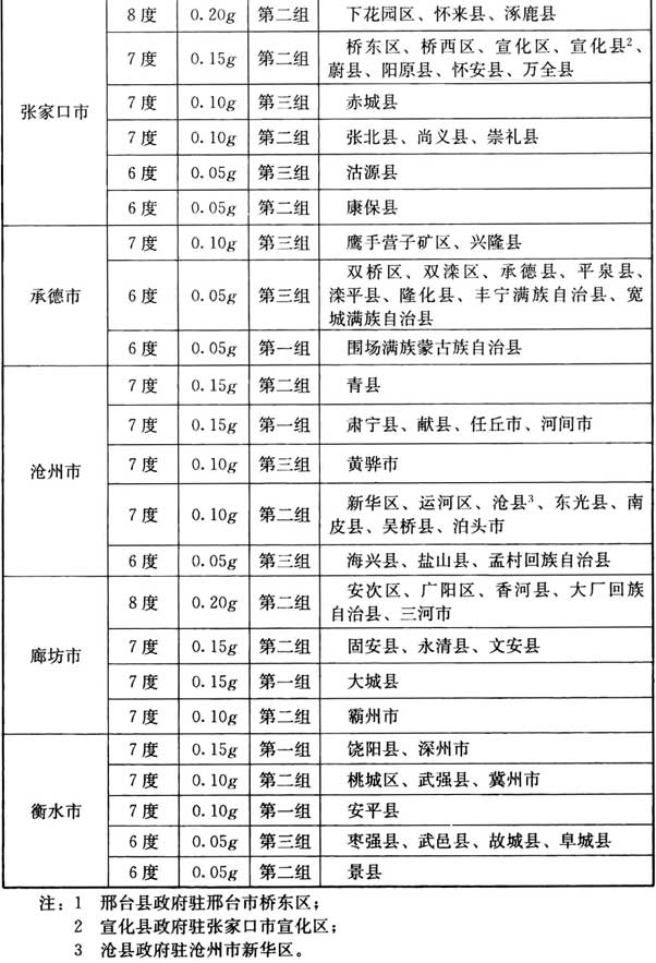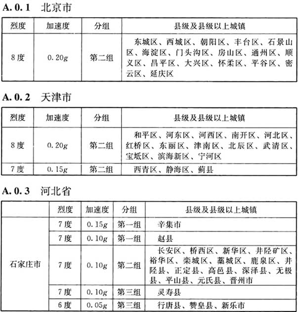 本附錄僅提供我國(guó)各縣級(jí)及縣級(jí)以上城鎮(zhèn)地區(qū)建筑工程抗震設(shè)計(jì)時(shí)所采用的抗震設(shè)防烈度(以下簡(jiǎn)稱“烈度”)、設(shè)計(jì)基本地震加速度值(以下簡(jiǎn)稱“加速度”)和所屬的設(shè)計(jì)地震分組(以下簡(jiǎn)稱(“分組”)。本表摘自《建筑抗震設(shè)計(jì)規(guī)范》 GB50011-2010(2016年版)附錄A