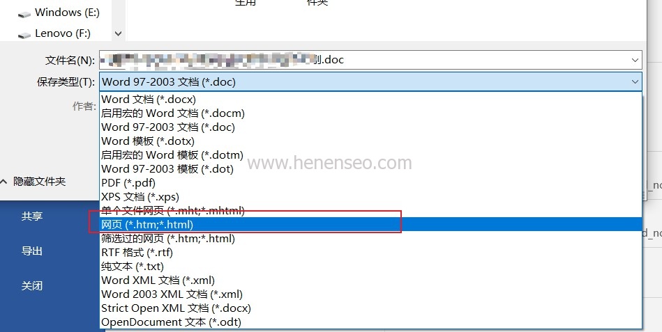 3、在另存為對(duì)話框中選擇文件類型為html網(wǎng)頁文件。