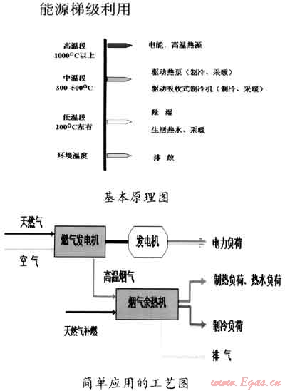 根據(jù)“高能高用、低能低用、溫度對口、梯度利用”的原理,對天然氣燃燒產(chǎn)生的高溫?zé)煔?,通過發(fā)電機來提供高品位的電能,對發(fā)電機排出的煙氣,根據(jù)用戶的需求,或產(chǎn)生蒸汽、熱水,或轉(zhuǎn)換成冷能,或用于除濕,從而將天然氣所含的能量盡可能地“吃盡榨干”,從而實現(xiàn)能源的高效利用,同時也達(dá)到較好的經(jīng)濟(jì)性。