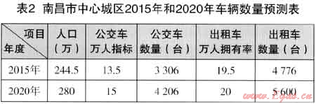 根據(jù)《南昌市出租汽車十年發(fā)展規(guī)劃(2010~2019年)》及推測(cè)數(shù)據(jù),2015年,2020年南昌市中心城區(qū)車輛數(shù)量預(yù)測(cè)見表2。