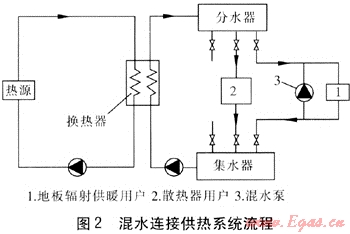 混水連接的工藝結(jié)構(gòu)簡(jiǎn)潔,降低了熱網(wǎng)造價(jià),循環(huán)泵的耗電量低,節(jié)省運(yùn)行費(fèi)用。隨著供熱系統(tǒng)逐漸完善,在擴(kuò)增或新建的供熱區(qū)域,采用大混合比的混水連接方式,特別是針對(duì)不同供暖方式的用戶(hù)無(wú)疑成為首要考慮的連接方式。