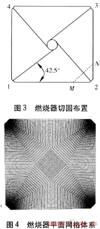 燃燒器切圓布置見圖3,從左下角逆時針旋轉(zhuǎn),燃燒器編號依次為1~4號角,1~4號角射流方向與前墻夾角均為42.5°,圖中虛線MN為計算結(jié)果分析時的輔助線。由于四角切圓鍋爐幾何區(qū)域的復(fù)雜性,采用直角坐標(biāo)系進(jìn)行數(shù)值計算時,其每個角上的一二次風(fēng)的入口方向與直角坐標(biāo)的網(wǎng)格邊界的夾角約為45°,這就容易產(chǎn)生數(shù)值偽擴(kuò)散[4],影響計算的準(zhǔn)確性。為減小偽擴(kuò)散,本文采用平面網(wǎng)格體系(見圖4)。爐內(nèi)計算區(qū)域采用了六面體網(wǎng)格,由圖4可知,燃燒器噴口附近的節(jié)距較小,并呈輻射狀,以適應(yīng)燃燒器射流的發(fā)展,盡可能使流體流動方向與網(wǎng)格邊界的夾角遠(yuǎn)離45°,最大限度地以垂直于網(wǎng)格邊界的方向進(jìn)入計算微元體。