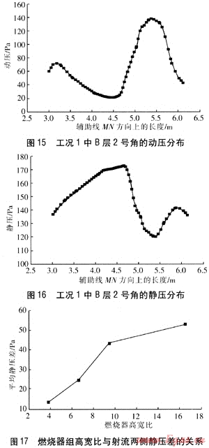 工況1中B層2號角的動壓分布見圖15,在輔助線MN方向上的長度為5.4m時,動壓達(dá)到最大,可以判斷這是燃燒器噴口噴出的射流中心所在的位置。工況1中B層2號角的靜壓分布見圖16,在輔助線MN方向上的長度為5.4m的兩側(cè),靜壓分別有兩個高峰值,這兩個峰值之差即為燃燒器噴口噴出的射流中心兩側(cè)的靜壓差,約32Pa。通過此種方法,可以計算出所有燃燒器射流中心兩側(cè)的靜壓差。各工況燃燒器射流中心兩側(cè)靜壓差平均值見表2,這里的平均靜壓差為各工況下所有燃燒器射流中心兩側(cè)靜壓差的算術(shù)平均值。由表2可知隨著高寬比的增加,燃燒器射流中心兩側(cè)平均靜壓差逐漸增大。