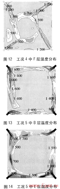 ⑤ 工況5中所有噴口全開,這時燃燒器的高寬比達(dá)到16.55。計算結(jié)果顯示,實際切圓直徑過大,氣流從燃燒器噴出后直接沖刷爐壁,由圖13、14可知,燃燒器平面的高溫區(qū)域均在壁面附近,這樣會在爐壁附近形成還原性氣氛,降低了灰熔點(diǎn),運(yùn)行中容易造成爐壁的結(jié)渣。