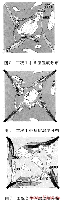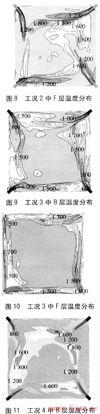 各工況下,燃燒器各層的溫度分布見圖5~14,圖中數(shù)值的單位為℃。由圖5~14可知: