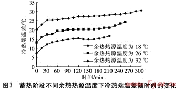 由實驗結果可知:余熱熱源溫度為18℃時,冷熱端溫差為20.20~30.95℃,制熱性能系數為1.52~1.14;余熱熱源溫度為26℃時,冷熱端溫差為12.55~23.20℃,制熱性能系數為1.86~1.51;余熱熱源溫度為32℃時,冷熱端溫差為6.50~17.3℃,制熱性能系數為2.23~1.71??梢钥闯觯酂釤嵩礈囟仍礁?,冷熱端溫差越小,制熱性能系數越大。