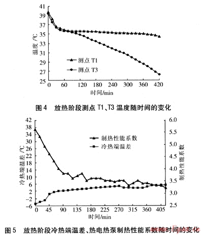 放熱階段冷熱端溫差、熱電熱泵制熱性能系數隨時間的變化見圖5。