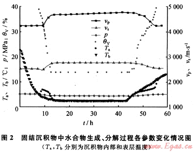 松散沉積物為采自于青島海邊的天然砂,粒徑為0.18~0.25mm,其物質(zhì)成分及含量如表2所示。由于難以探測松散沉積物的橫波速度,本文實驗僅獲取了縱波速度隨水合物生成和分解的變化情況(圖4)。結(jié)果表明,水合物剛開始生成時,縱波速度有一個陡然增大的現(xiàn)象,隨后由于超聲衰減極大,縱波速度難以獲取[13]。水合物完成生成時,含水合物松散沉積物的縱波速度為278m/s左右,比含飽和水沉積物的聲速增長1000m/s左右。