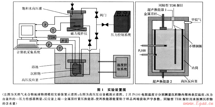 實驗在青島海洋地質(zhì)研究所水合物實驗室地球物理模擬實驗裝置上進行,該裝置主要由高壓反應(yīng)釜及內(nèi)筒、溫控系統(tǒng)、壓力控制系統(tǒng)、測試系統(tǒng)(包括超聲探測和時域反射探測)和數(shù)據(jù)采集系統(tǒng)5大功能模塊組成(圖1)。實驗過程為:在高壓反應(yīng)釜中模擬海底真實的溫度壓力條件,使水合物在沉積物中形成,同時采用超聲探測技術(shù)和時域反射技術(shù)(TDR,Time Domain Reflectometry)實時探測全過程中沉積介質(zhì)的聲學(xué)參數(shù)和水合物飽和度。為加快水合物生成進程,實驗采用300mg/L的SDS(十二烷基硫酸鈉)溶液和99.99%甲烷生成水合物。實驗的詳細介紹見本文參考文獻[8]、[9]。