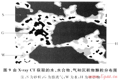 松散沉積物中的水合物微觀分布已由Jin等[18]通過X射線斷層掃描直接觀測(圖9)。結(jié)果表明水合物和沉積物顆粒間由水隔開,即水合物以懸浮狀形態(tài)存在于孔隙流體中,與筆者實驗中利用聲速所推測的結(jié)果一致。