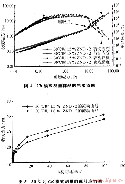 采用CR模式測(cè)量結(jié)果如圖4所示,在低剪切速率(γ)區(qū)域得到的應(yīng)力、應(yīng)變和黏度數(shù)據(jù)比CS模式在低應(yīng)力區(qū)域得到的穩(wěn)定,黏度先增加,表現(xiàn)出一個(gè)較為穩(wěn)定的平臺(tái),然后黏度急劇下降,黏度開始陡降處所對(duì)應(yīng)的剪切應(yīng)力即為屈服值。流動(dòng)曲線測(cè)試結(jié)果見圖5,將流動(dòng)曲線明顯偏離Y軸時(shí)的剪切應(yīng)力定義為屈服值,其值經(jīng)常比CS方式測(cè)得到的屈服值高。