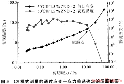 1) 選用CS控制應(yīng)力模式測(cè)量特種凝膠的屈服值符合屈服值定義,通過應(yīng)變一應(yīng)力雙對(duì)數(shù)曲線拐點(diǎn)能夠準(zhǔn)確的判斷凝膠樣品的屈服值。