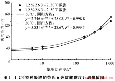 范氏旋轉(zhuǎn)黏度計(jì)測(cè)試的1.2%ZND-2的流變數(shù)據(jù)如圖1所示,采用帶屈服值的假塑性流變模式回歸得到的相關(guān)系數(shù)高,回歸計(jì)算得到的30℃、50℃的屈服值分別為28.08Pa、28.67Pa;而采用鉆井液靜屈服值測(cè)量方法得到的10min屈服值分別為33.5Pa和41Pa,高于回歸方法得到的屈服值。受量程限制,此法不能測(cè)更高濃度的凝膠ZND2。