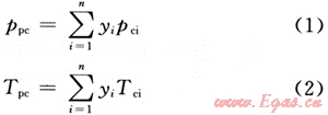 穩(wěn)定的純物質(zhì)及由其組成的定組成混合物具有固有的臨界點(diǎn)(即臨界壓力pc、臨界溫度Tc、臨界密度ρc)?;旌蠚怏w組分的臨界參數(shù)的計(jì)算方法如下[8]: