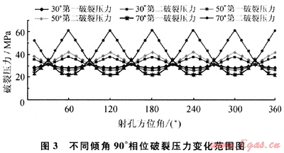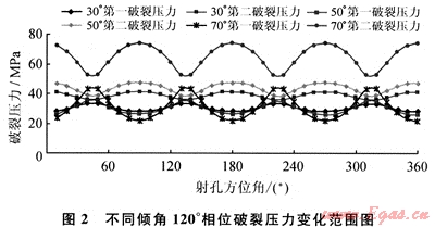 當(dāng)射孔方位角變化,各個(gè)射孔破裂壓力交替地達(dá)到最大、最小值,在某個(gè)方位角,多個(gè)射孔相應(yīng)就有多個(gè)對(duì)應(yīng)的破裂壓力,其中最小破裂壓力對(duì)應(yīng)射孔處裂縫最先產(chǎn)生;隨著這個(gè)裂縫延伸,由于裂縫近井效應(yīng),裂縫可能還會(huì)繼續(xù)在稍高破裂壓力對(duì)應(yīng)的射孔處產(chǎn)生,即達(dá)到第二破裂壓力值。圖2即為不同斜度120°相位射孔斜井對(duì)應(yīng)的破裂壓力,可以看出,三孔破裂壓力變化區(qū)間將比單孔的變化區(qū)間要小得多,可以確保破裂壓力在可控的范圍內(nèi)。