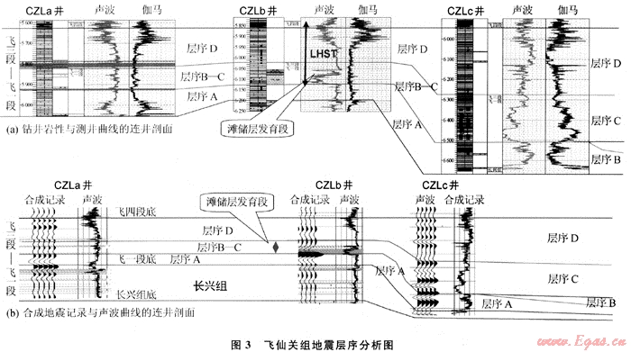 圖3是開江-梁平海槽西側(cè)分別位于臺地、生物巖隆和海槽的3口井的連井圖,利用測井資料與地震資料將飛一段至飛三段劃分出4套地震層序,合成地震記錄中黃色區(qū)域為儲層段。層序A為高位早期,水體較深,儲層基本不發(fā)育。層序B-C為高位晚期,儲層開始發(fā)育,CZLb井位于臺緣帶上,儲層段聲波曲線明顯降低,其儲層厚度較大,合成記錄上儲層底部地震反射明顯增強(qiáng);開闊臺地內(nèi)CZLa井在層序B-C內(nèi)雖有一定的儲層發(fā)育,但厚度明顯變薄,合成記錄上儲層底部反射異常與臺緣帶反射相比異常現(xiàn)象降低;位于深水海槽內(nèi)CZLc井在層序B-C內(nèi)無儲層發(fā)育。
