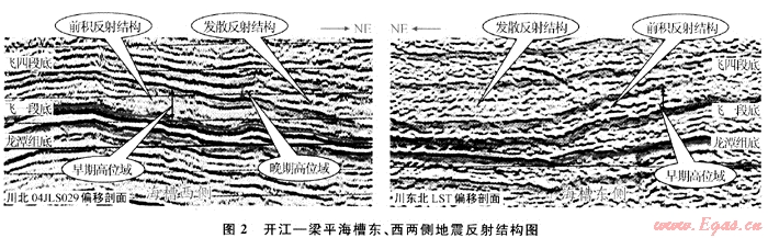 礁、灘的發(fā)育與其沉積前的古地貌關(guān)系密切,在高地或淺水臺地邊緣,其水動力相對較強(qiáng),有利于礁或灘的生長。若古高地暴露地表,則更有利于石灰?guī)r的次生白云化改造,促使優(yōu)質(zhì)儲層發(fā)育[7~8]。斜坡陡緩程度反映了水體能量的高低,圖2為開江-梁平海槽東、西兩側(cè)地震剖面,在海槽東西側(cè)具有明顯的前積和發(fā)散反射結(jié)構(gòu),其中前積反射結(jié)構(gòu)為早期高位體系域所具有的特征,發(fā)散反射結(jié)構(gòu)為晚期高位體系域所具有的特征。兩種反射結(jié)構(gòu)表明:飛仙關(guān)組沉積早期是繼承上二疊統(tǒng)沉積方式的欠補(bǔ)償沉積,而非快速充填沉積。