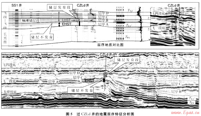 應(yīng)用地震層序分析技術(shù)尋找高能鮞灘儲層發(fā)育的地震層序,從而尋找鮞灘儲層發(fā)育的時間與空間。利用上述方法預(yù)測的CZLd井鉆遇飛仙關(guān)組鮞灘儲層厚47m,獲得工業(yè)氣流,同時鉆遇長興組生物礁儲層并獲得工業(yè)氣流。如圖5為過該井的測井資料與地震資料相結(jié)合的地震層序劃分,合成記錄中黃色部分為測井解釋儲層。