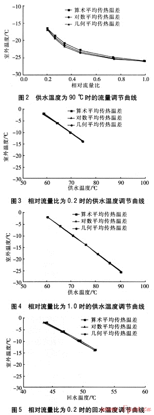 由圖1、2可知,分別采用這3種形式的平均傳熱溫差時,不同供水溫度條件下對應的水溫、流量調節(jié)曲線很接近。這主要是由于分別采用這3種形式平均傳熱溫差的散熱器熱流量計算式的擬合效果基本相同。