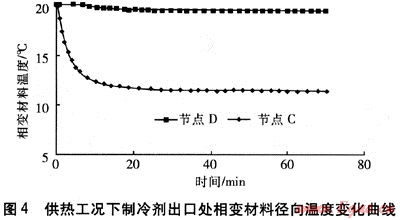 供熱工況下制冷劑入口處相變材料徑向溫度變化曲線見圖3。由圖3可知,在供熱工況下,系統(tǒng)開始運(yùn)行初期,相變材料徑向各節(jié)點(diǎn)間溫度的差異較大,鄰近制冷劑管壁的節(jié)點(diǎn)A溫度下降較快,而與水管壁相鄰的節(jié)點(diǎn)B溫度幾乎不變,直至30min后相變材料溫度場達(dá)到穩(wěn)定狀態(tài),之后沿徑向各個(gè)節(jié)點(diǎn)的相對(duì)溫差固定。