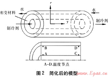 三套管相變蓄能換熱器是一種新型的集成節(jié)能設(shè)備,與普通套管換熱器相比,增加了安裝在內(nèi)外管間的中間層相變材料,這樣就將普通套管換熱器換熱功能與相變材料的蓄熱功能有機(jī)地結(jié)合[1]。相變材料的合理選擇決定著三套管相變蓄能換熱器的蓄熱效果,因此應(yīng)從熱力特性、物理特性、化學(xué)特性和經(jīng)濟(jì)性這幾個(gè)方面對(duì)其進(jìn)行評(píng)估。在設(shè)備實(shí)驗(yàn)試制階段,我們選用已經(jīng)商業(yè)化的相變材料——RT6,融化溫度為9℃,凝固溫度為6℃,相變潛熱為183kJ/kg,熱導(dǎo)率為0.4W/(m·K)。在太陽能熱泵系統(tǒng)供熱工況下,三套管相變蓄能換熱器作為蒸發(fā)器,外層為經(jīng)太陽能集熱器換熱的低溫?zé)崴艧幔瑑?nèi)層為制冷劑吸熱。由于RT6的熱導(dǎo)率較低,若相變材料層設(shè)計(jì)厚度不當(dāng),易導(dǎo)致制冷劑的吸熱量不足,則換熱器功能就由于增加了相變材料而變?nèi)?。本文針?duì)三套管相變蓄能換熱器穩(wěn)態(tài)傳熱運(yùn)行模式建立數(shù)學(xué)模型,研究相變材料層的溫度場變化。