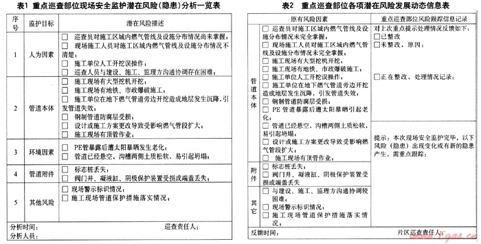 通過確定監(jiān)護目標并以此為前提實施風險識別,同時,對風險識別的結果做跟蹤監(jiān)控,根據(jù)監(jiān)護目標在施工過程中出現(xiàn)的變化調整監(jiān)控措施,隨時關注第三方施工工地區(qū)域內(nèi)影響燃氣管道安全運行的危險因素,并且適時采取措施予以控制;將項目目標動態(tài)控制原理應用在城鎮(zhèn)地下燃氣管線巡查中,能切實提高現(xiàn)場安全監(jiān)護效率。