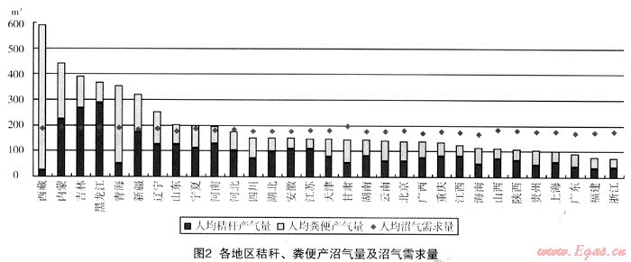 式中:c=4.18kJ/kg·℃,為水的比熱;m=40kg,為洗澡用水量;t1為熱水器進(jìn)水溫度(取當(dāng)?shù)啬昶骄汕驕囟纫妶D3);t2=40℃為熱水器出水溫度;n=120為洗澡次數(shù);η=80%,為熱水器效率;H1=20.4MJ/m3,為沼氣的低熱值(取沼氣成分為CH460%,CO240%)。各地區(qū)人均沼氣需求量即炊事用氣和生活熱水用氣之和,結(jié)果見圖2,圖中可以看出,西藏、內(nèi)蒙、吉林、黑龍江、青海、新疆、遼寧、山東、寧夏、河南等10個(gè)農(nóng)業(yè)或畜牧大省的沼氣理論產(chǎn)量能滿足農(nóng)民持續(xù)用氣需求。沼氣富余地區(qū)可以考慮發(fā)展沼氣采暖,沼氣不足地區(qū)則需要其他能源的補(bǔ)充。