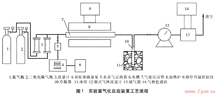 瓶裝氮氣及二氧化碳氣體分別經(jīng)流量計計量后進入氣化反應(yīng)管;蒸餾水由雙柱塞微量泵計量后進入水蒸氣過熱器,在水蒸氣過熱器中氣化為水蒸氣后進入氣化反應(yīng)管;氣化反應(yīng)管由帶程序升溫控制儀的加熱爐加熱到設(shè)定溫度;反應(yīng)產(chǎn)生的氣體產(chǎn)物經(jīng)冷凝器冷凝,除去其中的焦油及水蒸氣,經(jīng)濕式氣體流量計計量后進入儲氣袋,對儲氣袋中的氣體取樣分析后放空。