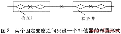 造成這種情況的原因較為復(fù)雜:一是補(bǔ)償器自身質(zhì)量偏差較大,雖型號規(guī)格相同但剛度差距大,無法自由伸縮;二是受管材加工制作質(zhì)量與安裝質(zhì)量影響,無法自由伸縮,駐點(diǎn)兩側(cè)管道受力不均,造成駐點(diǎn)偏移大,駐點(diǎn)不固定,使波紋管補(bǔ)償器無法承受,最終造成破壞。除非對補(bǔ)償器自身作較大改進(jìn),保證波紋間均布限位使波紋管補(bǔ)償器剛度均衡趨于一致,否則采用普通補(bǔ)償器條件下,還應(yīng)按照每兩個(gè)固定支座之間只設(shè)一個(gè)補(bǔ)償器的原則進(jìn)行布置(見圖2)。