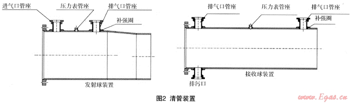 清管裝置用于管道清掃,分為發(fā)射球裝置和接收 球裝置兩部分(如圖2)。