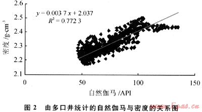 對(duì)未擴(kuò)徑處的自然伽馬與密度進(jìn)行相關(guān)分析,根據(jù)圖2的關(guān)系式,通過(guò)自然伽馬求取密度值。