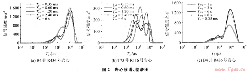 可見要獲得好的核磁共振信號,必須有足夠長的等待時間,讓大孔徑孔隙中的氫核完全極化。這一現(xiàn)象也說明在孔隙孔徑大的地層中,若利用差譜法識別流體性質(zhì)時,如果短等待時間測量時的等待時間不足,并不是所有的有差譜信號的儲層都為油氣層,發(fā)育大孔徑孔隙的水層也可能出現(xiàn)差譜信號[5]。